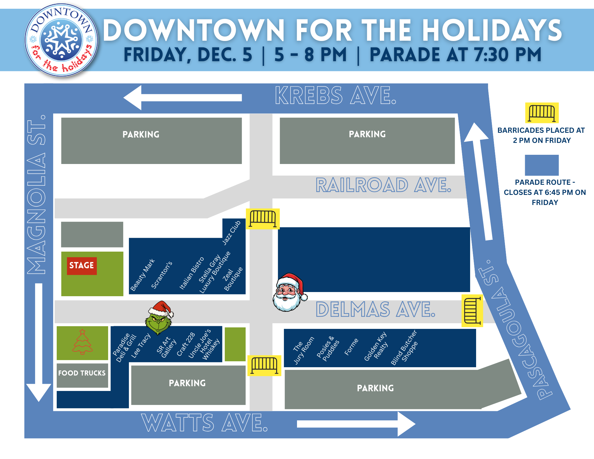 - Premier position in the Christmas Parade, either behind the Grand Marshal or before Santa’s boat