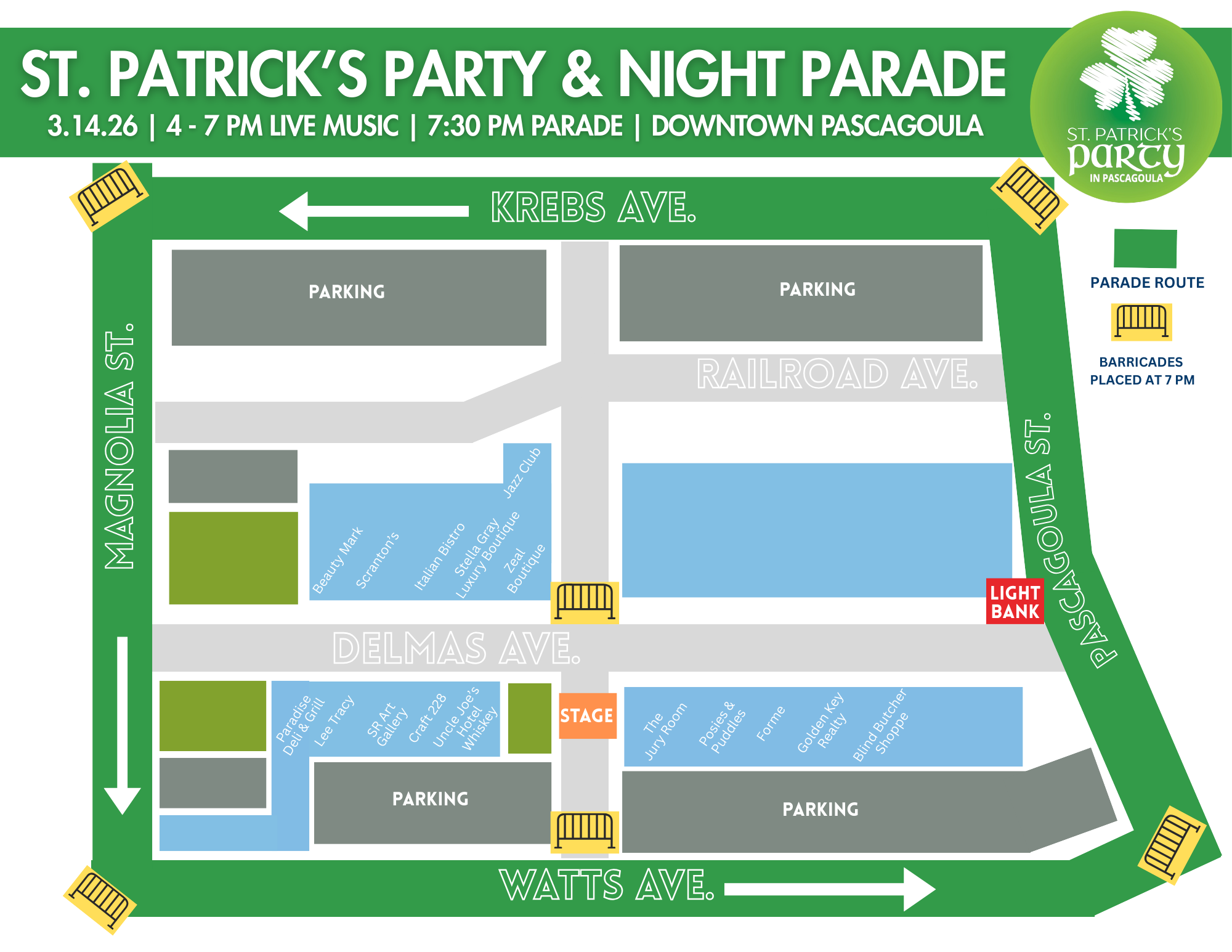 Complete the form below to register for this year’s 2026 St. Patrick’s Parade in Downtown Pascagoula.